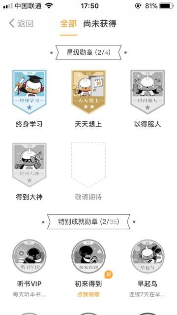 成就徽章:完成什么特定行为能够获得什么样的“称号”或者“徽章”。
