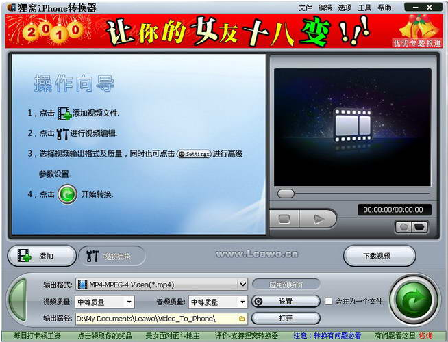 狸窝iPhone格式转换器是一款功能强大,操作简便的高速iPhone视频转换器,它可以转换几乎所有流行的音视频格式:RM、RMVB、VOB、DAT、VCD、DVD、 SVCD、ASF、MOV、QT、MPEG、WMV、MP4、3GP、DivX、XviD、AVI为iPhone手机支持的视频格式,让您随时在iphone上享受最新的影音乐趣。