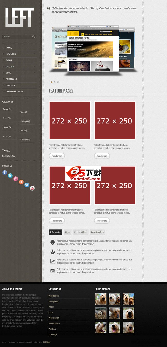 灰色居左html5企业网站模板,简洁大气,全套模板,DIV+CSS布局,包含blog.html,contact.html,features.html,gallery.html,index.html,portfolio.html,single.html,skins.html等多个页面网站模板。