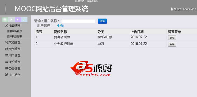 MOOC简约后台管理界面模板,全套模板,包括登录、视频管理、文档管理、类别管理、用户管理、评价管理、公告管理等多个后台模板页面。