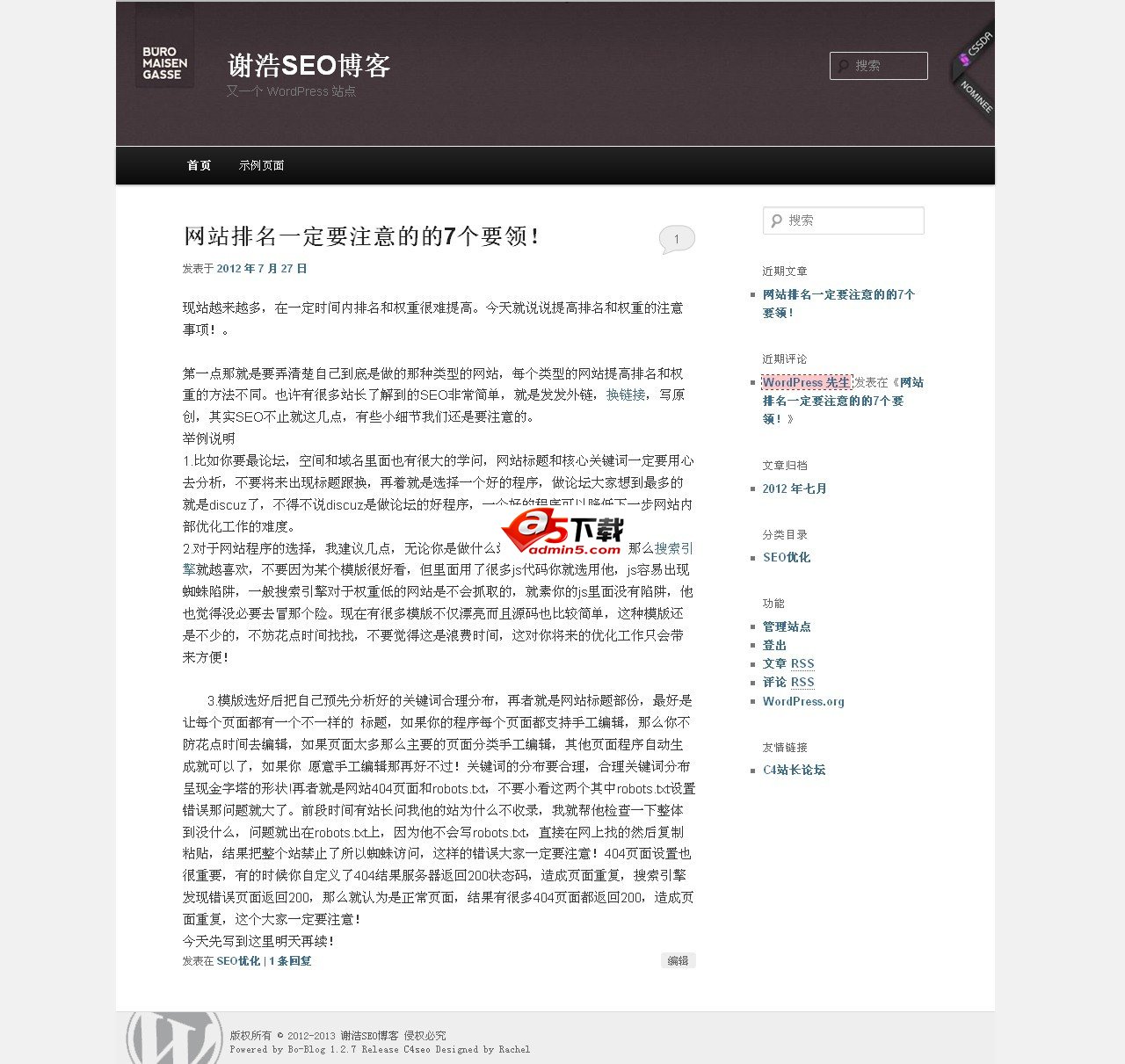 super_seoer的主题是一款非常简单的主题,由于作者能力有限制,有些功能不能开发到位还请谅解!这样是作者第一次开发WordPress主题,请大家以后多多支持,我会更加努力。申明:此套wordpress模板为super_seoer个人原创作品,望使用者尊重他人的劳动果实!