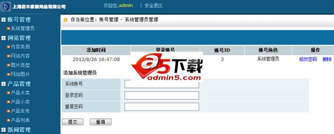 可以添加和修改管理员账号、添加网站图片、网站介绍、关于我们、添加产品大类、小类 产品详情、产品列表 新闻管理 新闻类别
