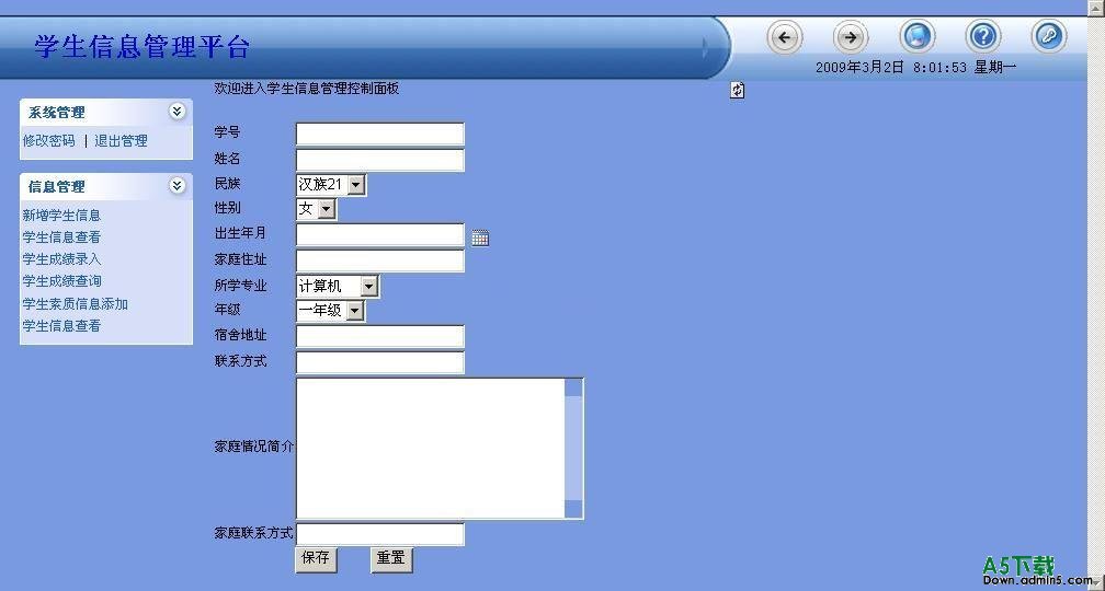 由班主任输入,包括如下内容:姓名(有可能达到10个字)、民族、性别、出生年月、家庭住址、所学专业、宿舍地址、联系方式、家庭情况简介、家庭联系方式。