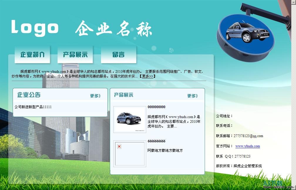 娱虎企业管理系统包含产品展示、企业公告、企业简介、留言等的栏目,