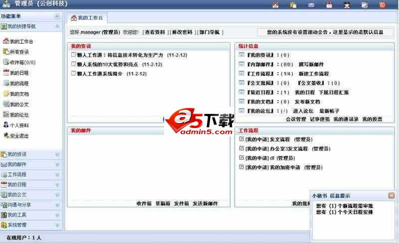 懒人工作通 网络智能办公系统是适用于企事业单位的通用型网络办公软件,融合了云创科技长期从事管理软件开发的丰富经验与先进技术,该系统采用领先的B/S(浏览器/服务器)操作方式,使得网络办公不受地域限制。