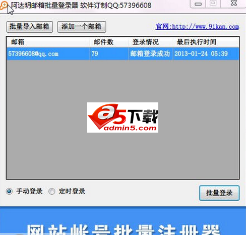 阿达明邮箱批量登录器可以批量导入邮箱帐号密码,批量登录邮箱,可以手动批量登录,也可以定时登录.有了它你不用担心大量的邮箱长期不用而被收回或者重新激活了