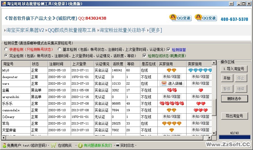淘宝旺旺状态批量检测工具是智者软件出品的一款批量检测淘宝旺旺号是否异常、被封、注册时间、最后登录时间、认证情况、活跃度、等级、信用的软件,无需密码,免登录批量查