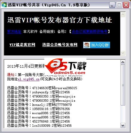 迅雷vip账号共享7.9尊享版绝对精简,包含迅雷VIP帐号近百个!迅雷会员可使用离线下载,多线程下载,高速通道下载,迅雷看看弹出式播放,去广告等等特权! 此次更新采用了万网的专用服务器来更新迅雷vip帐号,解决了以前网络不畅无法显示的问题。