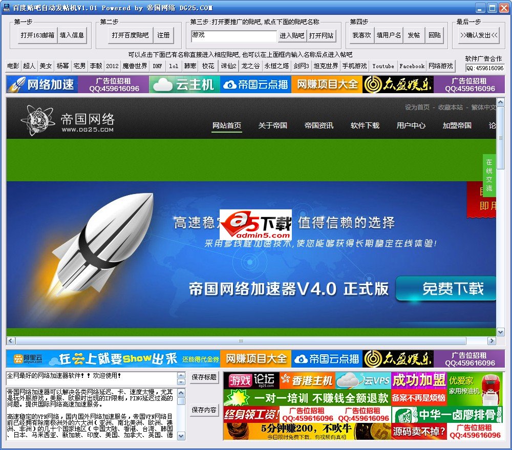 百度贴吧自动发帖机是目前最新最有效、最实用的一款百度贴吧自动发帖机,全程模拟人工输入验证码,全程实现人工自动发帖效果。可无限注册贴吧帐号,无需更换IP即可快速海量发布您的广告信息的最好工具。含视频教学内容。