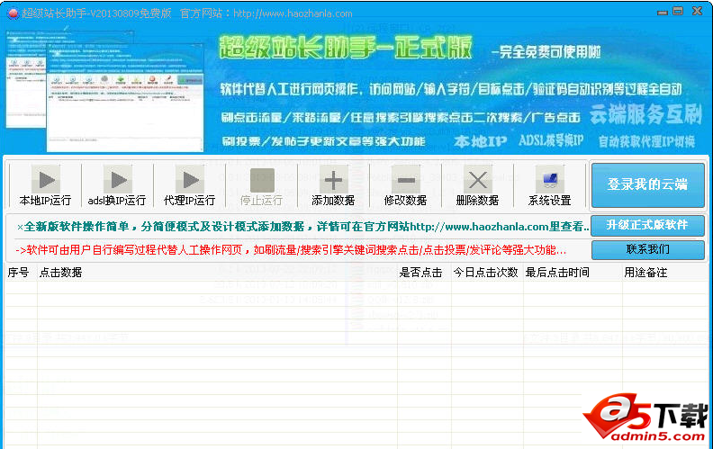超级站长助手软件是自动操作网页软件,功能强大,可代替90%以上的手工操作网页。软件是完全按照用户正常操作网页而设计,可完全代替人工操作网页,软件采用简单模式编写脚本操作网页,共有四大模块:第一.访问网页,第二.输入字符,第三.执行点击,第四.验证码自动识别输入,基于以上四步骤,只要你按照自行需求组合不同步骤即可完成不同的功能,比如直接刷流量点击/刷来路流量点击/刷搜索引擎关键词点击/搜索引擎二次搜索点击/刷广告点击/刷投票点击以及评论留言自动发表等强大功能。
