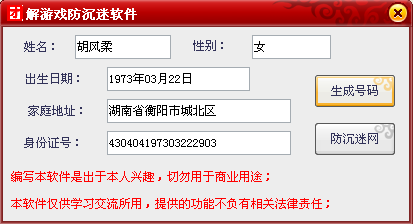 解游戏防沉迷软件是一个解除QQ飞车、地下城DNF等等所有QQ游戏防沉迷的免费解除防沉迷工具,可以生成身份证号码跟名字、性别、出生时间、家庭住址。