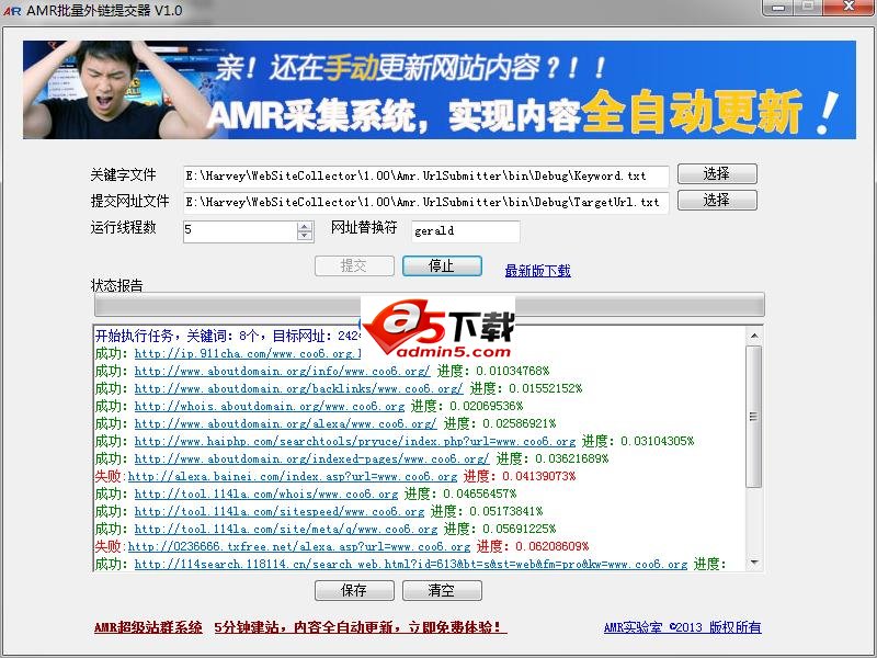 AMR免费外链提交器提交原理很简单,通常我们在某个网站搜索一个关键词或网址,服务器会暂存我们的搜索痕迹,这时搜索引擎的蜘蛛正好抓住了这个痕迹,自然就留下了外链。