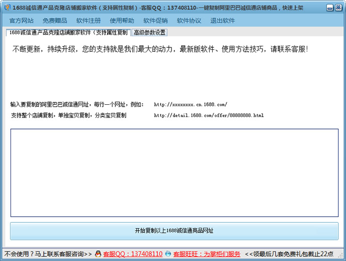 1688诚信通产品克隆店铺搬家软件(支持属性复制)可以帮助您任意复制自己或他人的店铺到您的1688诚信通店铺,快速发布产品,节约大量时间,全自动复制,快速开店!让您有更多的时间打理生意,宣传自己的商品,工作变得简简单单。
