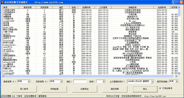 布衣淘宝帐号过滤助手,您只需导入淘宝名称,软件就可以快速采集淘宝帐号的各种相关信息,如,家信用、卖家信用 、地区、姓别、注册时间、最后登陆时间、淘宝店铺名称和创店时间。软件还可以按采集到的信息来自定义分类、过滤,导出你想要的帐号,删除你不想要的,绝对是淘宝帐号过滤助手。
