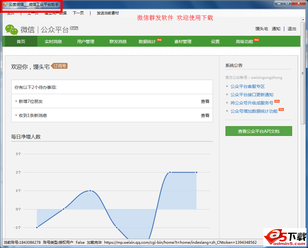 微信公众平台模拟群发器V1.0 由云度微信开发销售。本软件实现批量对单个用户发送图文消息,从而达到模拟群发的效果,目前只支持发送图文消息。