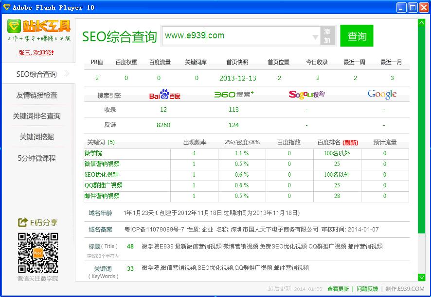 E+站长新工具是基于flash技术开发的站长工具客户端,是SEO和网络营销人员必用的工具,提供SEO综合查询,百度排名,360排名,搜狗排名,Google排名,百度权重查询,PR值查询等功能,另提供土豪级的5分钟免费学习网络营销实践视频哦,2014年最全最快最吊的SEO工具助手。