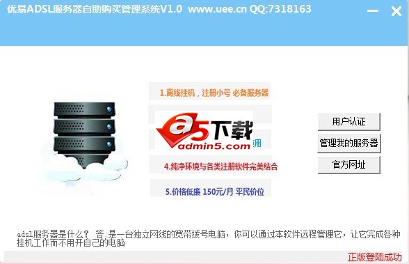 优易adsl服务器是优易软件公司独家推出的一款服务器,服务器采用纯净的操作系统可以屏蔽安全控件的检测适合特殊用户的需求使用,优易服务器24小时运行机房配置了不间断电源从而有效防止数据的丢失。同时优易adsl服务器拥有独立的带宽每日30万IP数据可拨号切换并不会断掉远程控制。其次用户可通过软件远程对服务器进行时时控制,