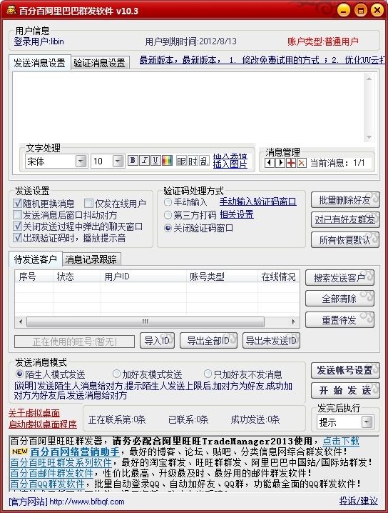答:软件利用机器模拟人工行为来发送消息,达到最大化的发送程度以及最小化的封号,详细大家可以看一下在线教程。目前利用阿里巴巴中国站号、淘宝号都可以群发阿里巴巴消息/群发贸易通消息,阿里巴巴中国站号可以发送陌生人消息,淘宝号可以发送加好友消息。