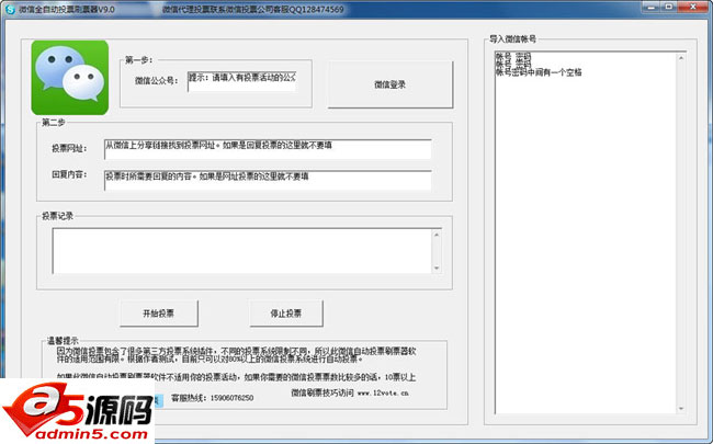 温馨提示:因为微信投票包含了很多第三方投票系统插件,不同的投票系统限制不同,所以此微信全自动投票刷票器软件的适用范围有限。根据作者测试,目前只可以对80%以上的微信投票系统进行自动投票。