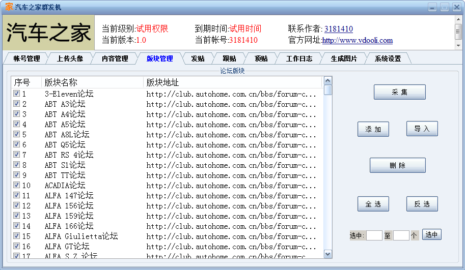 3、可批量上传头像,全自动一键采集论坛版块!