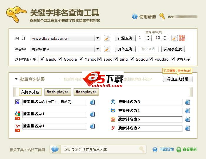 观其关键字排名查询工具可查询某个网址在某个关键字搜索结果中的排名。查询关键字在Baidu、google、yahoo、soso、bing、搜狗、有道和360搜索八大搜索引擎中的排名。工具具有自定义保存网址和关键字、批量查询、查询结果导出、百度指数批量查询、相关关键字查询、关键字密度查询等功能,提高您在seo关键字排名方面工作的效率。