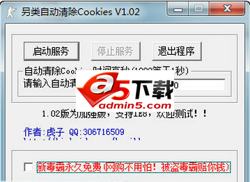 另类自动清除Cookies工具是一款能够定时自动清除Cookies,可以用于解决一些因Cookies出现问题的网页软件或游戏。加强版支持IE8。