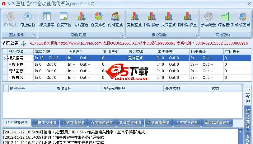 A17-SEO全功能优化软件系统能模拟人工刷百度下拉框、百度相关搜索、百度排名、网站排名、网站Alexa排名、百度竟价互点、提升网站权重等功通。