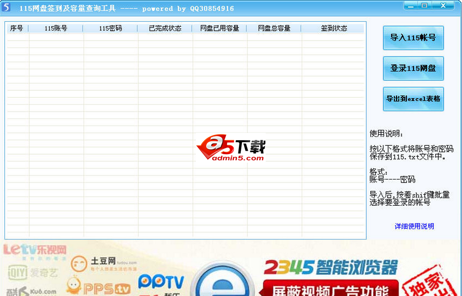 115网盘批量登录签到工具是一款115网盘帐号批量登录签到软件。能实现快速批量登录您的115网盘并为您进行签到,以扩充网盘的容量。濾件还具有登录后显示网盘总容量、已用容量功能(这个功能目前同类软件都不再提供),同时还可以把相关信息导出到excel表格,大大方便了网盘数量多的用户对网盘进行整理。