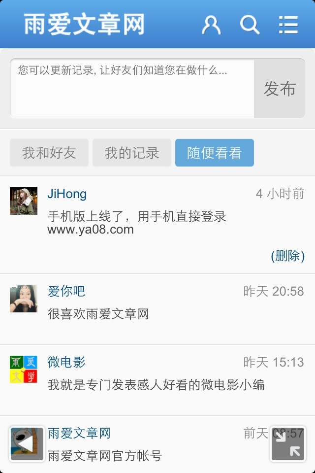 雨爱文章网手机版,手机打开浏览器直接输入 www.ya08.com 拿出手机,随时随地记录心情、发文章、写日记、看散文、找语录、传照片。独有的网站界面和触屏设计,手机论坛也变得赏心悦目,操作自如。