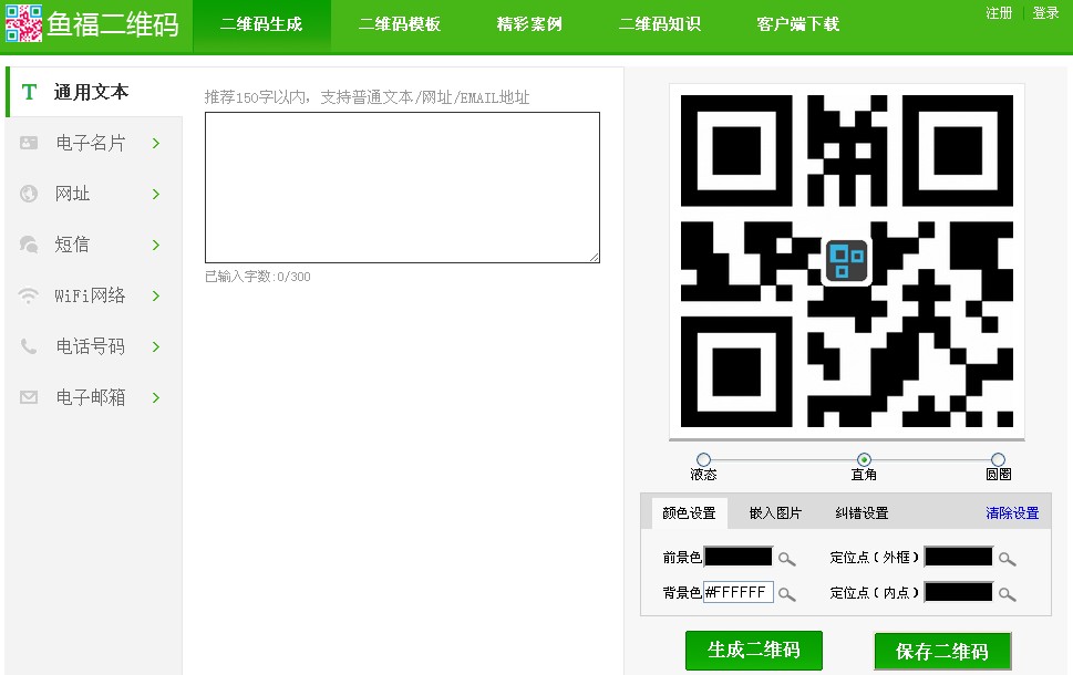 二维码CMS目前已提供通用文本、电子名片、网址、短信、WiFi网络、电话号码、电子邮箱等彩色、液态、直角、圆圈二维码的在线生成功能。