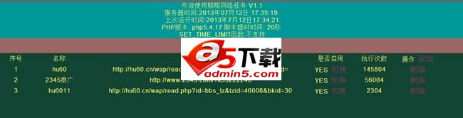 3.自定义执行次数,例如:自定义的次数为10次,当你的服务器不支持set_time_limit时,任务开始执行时,任务将会不间断重复执行10次;而当你的服务器支持set_time_limit 时,任务执行时,任务将会执行一次然后休眠1分钟,然后再执行一次,直到10次执行完,这需要10分钟.若支持set_time_limit,建议每次执行次数设定为1-10,更大将会加重服务器负荷.若不支持,建议每次执行次数设定为10-50,100次只做瞬时测试.