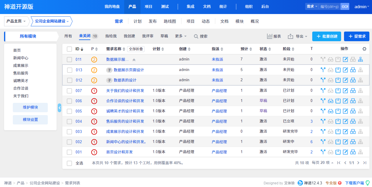 1. 产品管理:包括产品、需求、计划、发布、路线图等功能。