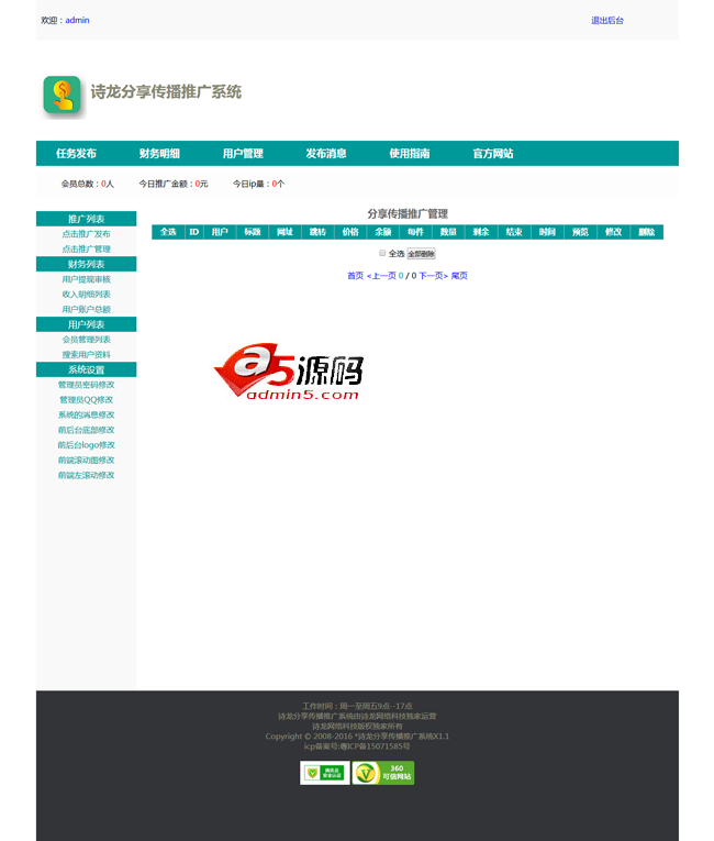 诗龙分享传播推广系统是一款智能推广系统,适用于推广淘宝商店,网站,电子商务等等,如今百度竞价,搜狗竞价等,高额的费用超低的转化率,已经不适合中小型企业和个人,本系统具有推广费用低,全人工推广自动计费,多重防作弊等功能,可设定本站页面的图文发布推广,也可设定倒计时进行跳转到淘宝店,网站等,是中小型企业和个人的首选推广产品。