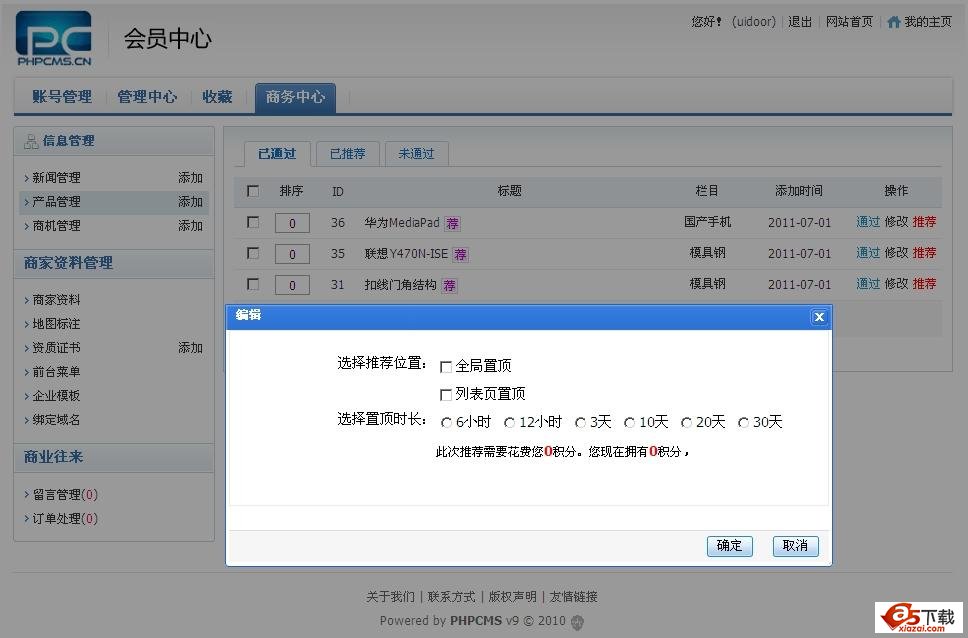 9、管理员可以对商家用户的信息二次编辑,支持推送至推荐位及推送到其他内容模型功能;