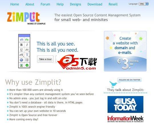 Zimplit是一个非常简单的CMS管理系统。它没有复杂的管理界面,登录之后只有一个易于使用,用于编辑整个网站的工具箱。利用它可以为页面添加图片,链接,编辑HTML。将某一页面另存为新页面的模板。无需数据库,所有数据都存储在HTML页面中。利用Zimplit生成网站是100%搜索引擎友好(Search Engine Friendly)。