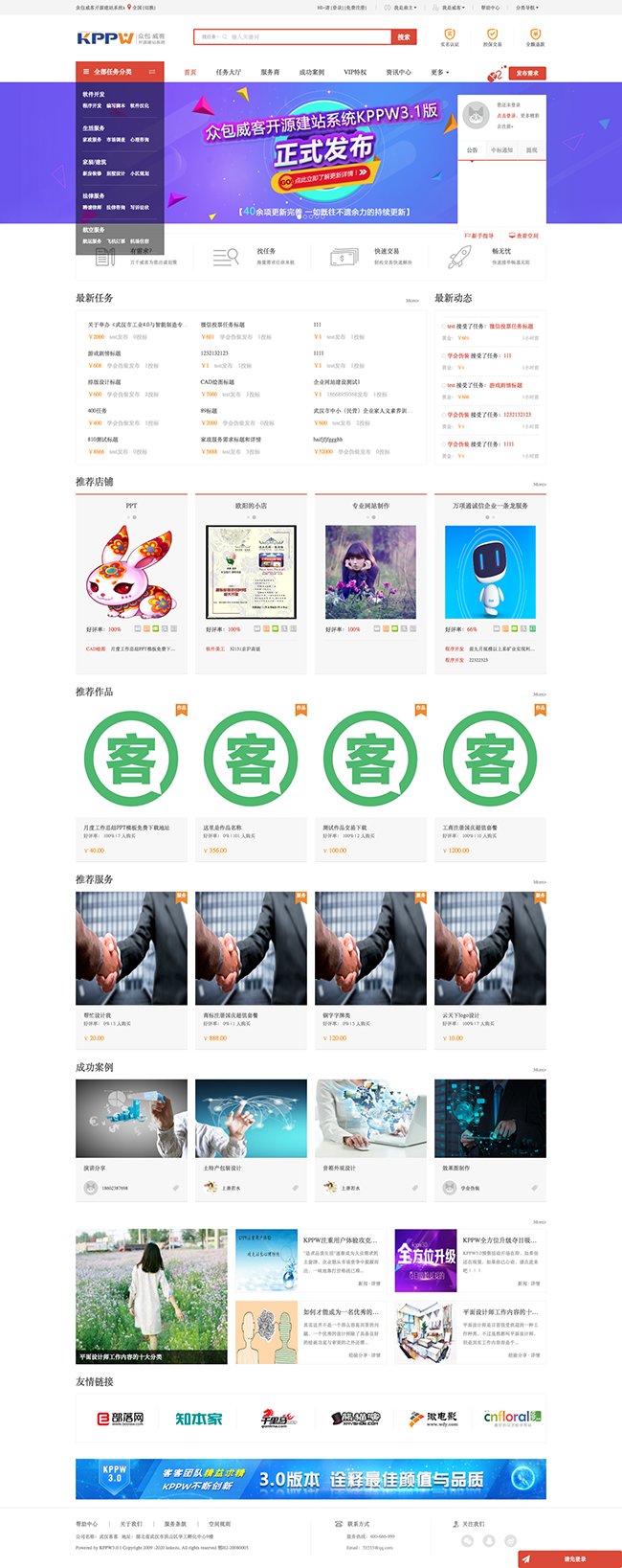 产品业务核心功能是基于任务悬赏交易和用户服务商品交易为主构建一个C2C的电子商务交易平台,其主要交易对象是以用户为主的技能、经验、时间和智慧型商品。经过多年发展,KPPW系统解决方案成熟,站长用户群稳步增长。产品成为同类开源建站产品的领导者,是搭建在线服务交易平台的首选产品。