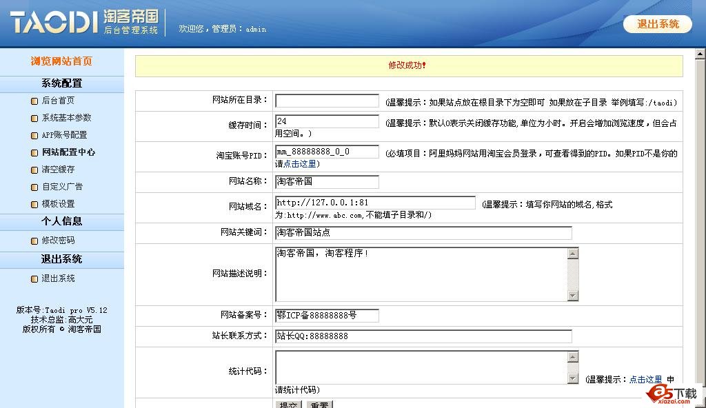 基本参数配置:配置App,PID,站长联系信息,备案信息,统计代码,更改管理员密码等!