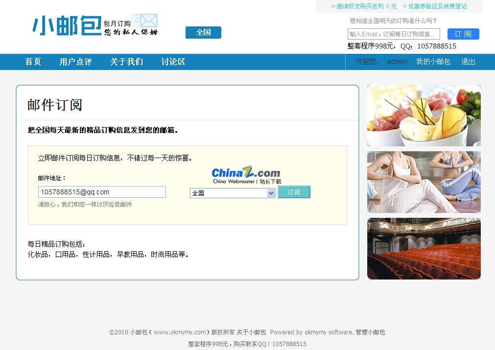 小邮包-包月订购包年服务网,该程序由好买卖商城开发,程序采用PHP+MYSQL架设,程序商业模式为目前最为火爆的包月订制包年服务模式,这种包年订购在国外网站已经热火很多年了,并且已经发展到一定规模,像英国的男士用品网站BlackSocks,一年的袜子购买量更是达到了1000万双。
