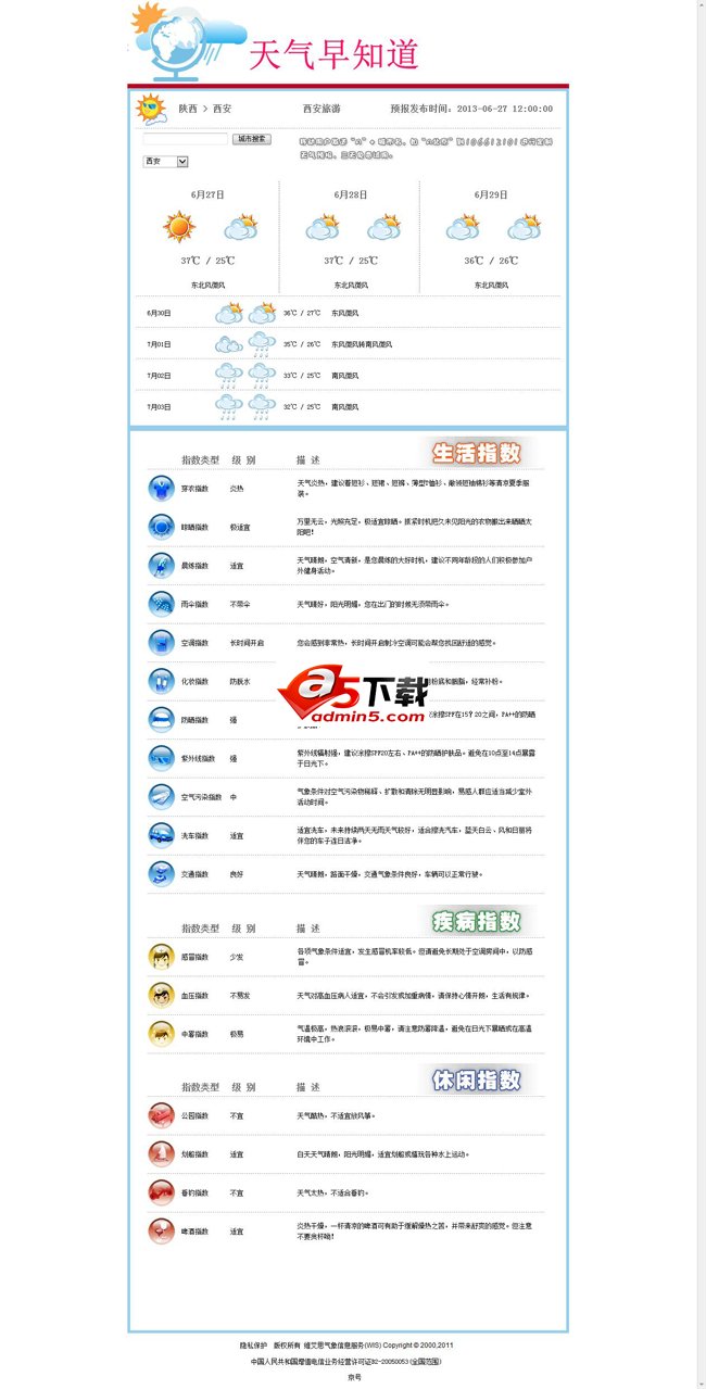 一些参数在config.php里,请修改下就可以了。 程序可查询一周天气情况。支持搜索,另外有生活指数,疾病指数和休闲指数三个小参数。程序使用的图片已经下载到本地。下次更新将支持伪静态。本人新学PHP,此程序仅供学习。 使用此程序需保留连接www.59info.com
