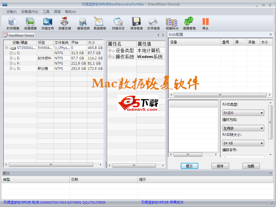 本软件采用高效的数据结构以及分析算法,从磁盘底层读出原始的扇区数据,将丢失或损坏的目录和文件在内存中进行快速精准重建。支持IDE/SCSI/SATA/SAS/USB等接口硬盘,RAID磁盘等存储介质,支持HFS,HFS+,HFSX等Mac操作系统常用的文件系统格式(亮点在于速度快,精准),支持OFFICE2003/OFFICE2007/WPS/ PhotoShop/ JPG/ AVI/ MOV/MPG/ MP4/ 3GP/ MTS/RMVB/ PDF/WAV/ZIP/RAR等多种文件类型的恢复(亮点在于支持各种录像机的视频,各种相机的图片的恢复)。支持RAID0,RAID1,RAID10,RAID4,RAID5,RAID6,RAID5E,RAID5EE,RAID ADG,HP双循环等标准RAID级别,亮点在于支持非标准的RAID级别,能够很容易的在软件上进行编辑,可以在允许缺盘的级别,支持缺盘组合。