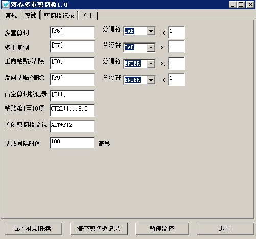 双心多重剪切板是一个windows下增强版的剪切板软件,能让你把多次复制到剪切板的内容合并后正反向粘贴,粘贴时可以加入回车或者TAB键作为间隔。