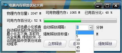 电脑内存释放优化大师,是一款免费绿色的电脑优化的软件.很多老爷机电脑的网友都经常抱怨电脑玩一段时间后会变的很卡,卡的原因基本就是内存占用率过高,电脑内存释放优化大师可以释放电脑内存里的垃圾达到优化内存的作用,使老爷机重回年轻.软件支持定时释放内存,非常方便,并且软件不会和其它软件一样在安装的时候会向电脑里添加很多启动项,占用更多的电脑资源.电脑内存释放优化大师这款软件,完全免费绿色,不需安装直接使用.占用内存非常少.