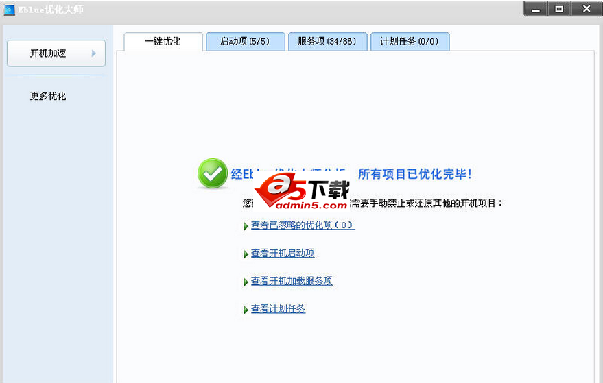 Eblue优化大师是一款极好的系统优化软件,该软件目前支持开机启动项优化、服务项优化、计划任务优化,优化后的程序仍可以恢复,您也可以手动删除启动项。Eblue优化大师大大地方便了您管理启动项。虽然360安全卫士等也有类似功能,但对于不需要哪些臃肿功能的人来说,Eblue优化大师是一款很好的选择。