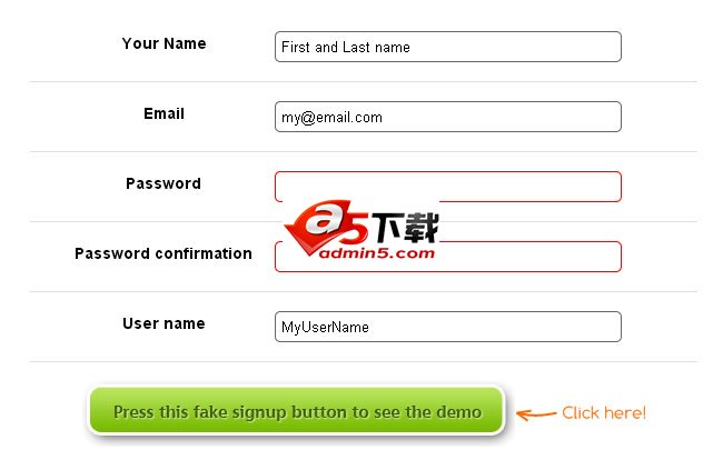jQuery超棒动态表单验证效果是一款如果填写数据验证失败,输入框会显示红色,点击按钮后,不合法的输入框会左右摇晃提醒用户,非常棒的效果。
