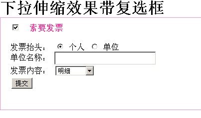 这是一个使用jQuery插件实现的伸缩效果,在网页上,单击单选按钮,也就是Radio元素后,所属的对应内容向下拉出,伸展开来,平时是不显示的,可用在发票查询等场合。
