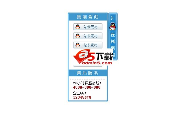 鼠标滑过显示在线客服是一款界面简洁大气,鼠标移动到自动展开,鼠标移走自动隐藏,切换也非常的流畅,可放客服QQ、客服热线,其他内容自己修改代码即可。