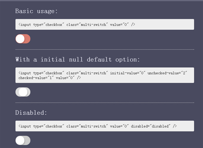 本特效源码是一款基于jQuery插件multiSwitch的实现3种状态的IOS样式滑动按钮的代码。该滑动按钮可以初始化为3种状态,初始化状态,选择状态和不选择状态,外观为IOS样式,非常时尚。本代码适用浏览器:搜狗、360、FireFox、Chrome、Safari、Opera、傲游、世界之窗,不支持IE8及以下浏览器。有兴趣的朋友们可以来下载试试吧。本段代码兼容目前最新的各类主流浏览器,是一款非常优秀的特效源码。希望大家可以喜欢!