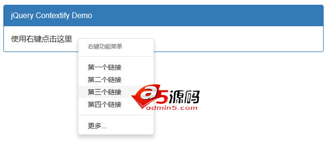 jQuery鼠标右键点击弹出菜单基于bootstrap-3.3.6制作,在页面指定区域鼠标点击右键弹出功能菜单。