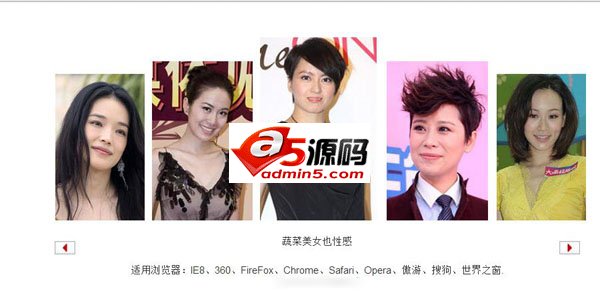 js多图循环滚动特效是一款支持多图循环滚动显示的js图片特效代码,带左右箭头按钮,可以让图片左右无限滚动显示,支持设置图片标题显示,兼容IE6/7/8/9及主流浏览器