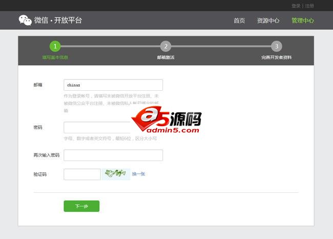 jQuery微信开放平台注册表单是一款仿微信开放平台的选项卡带步骤的注册表单验证jQuery代码.